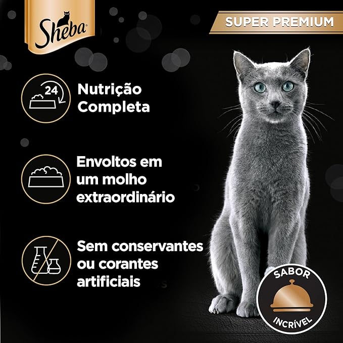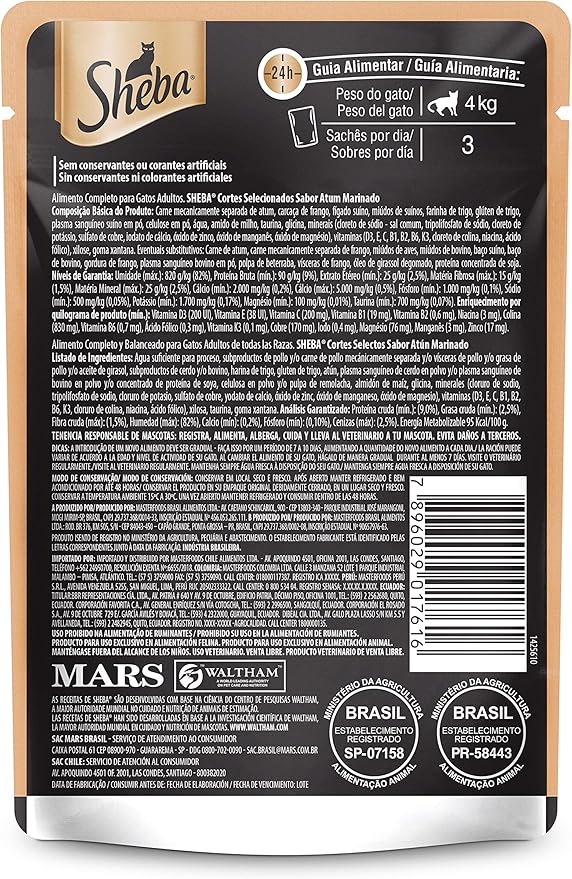 SHEBA® acredita que gatos são felinos verdadeiramente especiais, além de serem elegantes e confiantes, sabem usar o charme para conseguirem o que querem como ninguém. Então, quando os gatos querem a Ração Úmida Sheba Sachê Cortes Selecionados Sabor Carne ao Molho para Gatos Adultos não dá para resistir. SHEBA® oferece uma linha de alimento úmido Super Premium, completo e balanceado, sem conservantes ou corantes artificiais e que garante a combinação perfeita entre sabor incrível e nutrição. As receitas de SHEBA® são desenvolvidas com base na ciência do Centro de Pesquisas WALTHAM, a maior autoridade mundial no cuidado e nutrição de animais de estimação. SAC MARS BRASIL – Serviço de Atendimento ao Consumidor caixa postal 61 CEP 08900-970 – Guararema -SP DDG 0800-702-0090 sac.brasil@mars.com.br – www.sheba.com.br